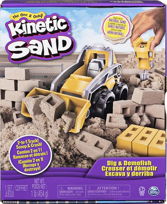 Kinetic Sand is the original squeezable sand you cant put down. 2lbs of brown Kinetic Sand a dump truck and a working crane with wrecking ball and bucket attachments. Kinetic Sand is the original magical moldable and mesmerizing sand.